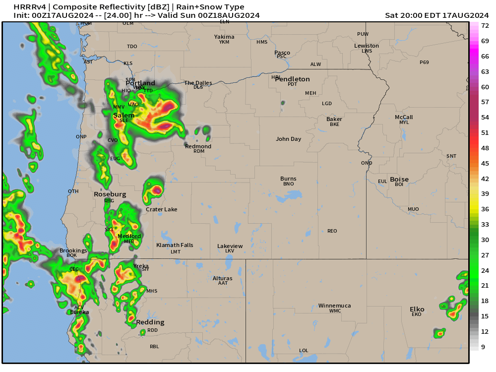 At some point between 2pm and 5pm powerful storms will roll up the valley from the south/southeast. Storms could last well through the evening with some weather models hinting at a second round of storms sometime shortly after sunset. Impacts will include gusty winds above 40mph in some locations, heavy rain, localized flooding, and numerous lightning strikes. Hail could be present in these storms too. This is about as close as we can get to a mid west type of storm. Below is the estimated radar for 5pm. Don’t get caught up looking at the exact locations of the storms in this image, but take in the big picture here which is showing very strong storms throughout the Willamette Valley and Cascades Saturday afternoon and evening.