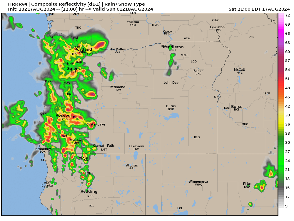 At some point between 2pm and 5pm powerful storms will roll up the valley from the south/southeast. Storms could last well through the evening with some weather models hinting at a second round of storms sometime shortly after sunset. Impacts will include gusty winds above 40mph in some locations, heavy rain, localized flooding, and numerous lightning strikes. Hail could be present in these storms too. This is about as close as we can get to a mid west type of storm. Here’s an updated estimated radar image for 6pm today showing more widespread storms rolling through the valley.