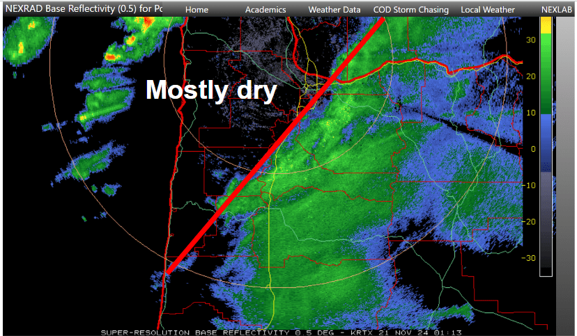 A band of steady precip trained close to the same position for almost 6 hours Wednesday! The forecasting models I use hinted at this happening, and I knew it was possible, but nothing showed it being quite that consistent. Most of west Salem, Amity, McMinnville, Dallas all had a mainly dry day; however, parts of south Salem, Stayton, Turner, and Albany experienced rain for much of the afternoon and early evening hours.