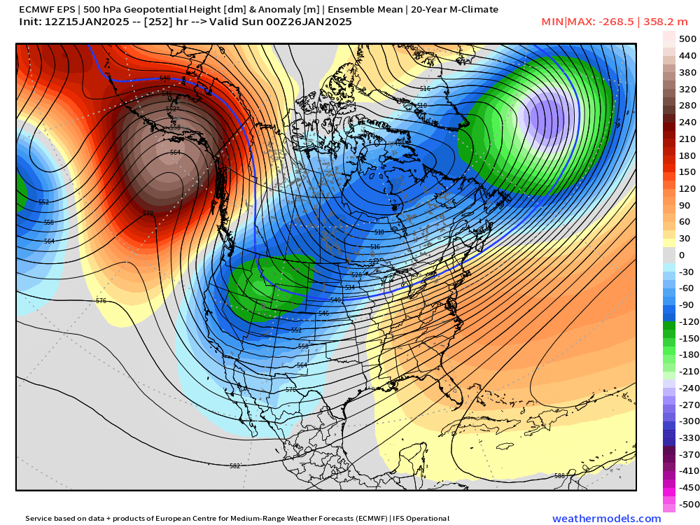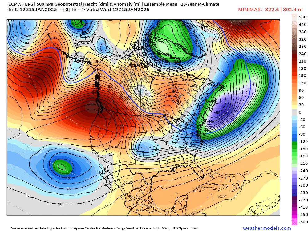 Over the past few days we have been in a pattern some people call “fake cold.” Regardless of what type of “cold” it is, the feeling on your skin is very much the same lol. This type of pattern would actually bring us very warm temperatures during spring or summer, but the low sun angle and long nights keep us cold down here in the valley below the layer of clouds and fog thus the name “fake cold.” This chart is a look at height anomalies for this time of year around thirty thousand feet up in the atmosphere. Basically Oregon is directly under a very warm ridge of high pressure.