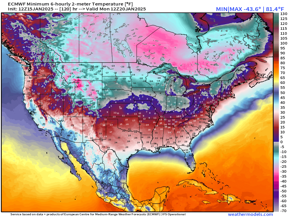 This weekend a frigid and deep arctic air mass plunges into the center of the nation. Temperatures will fall below zero in many locations in the upper midwest. Check out the forecasted morning lows for this coming Monday. Lows in the upper 20s to 30 right along the Gulf of Mexico even. Brrrrr! Click the image for a closer look.