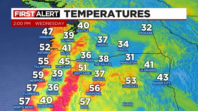 While we sat in the upper 30s under a chilly blanket of fog and low clouds these past few days, locations in central Oregon and along the coast have been soaring into the mid to upper 50s thanks to the warm atmosphere up above. Check out the 2pm temperatures from today.