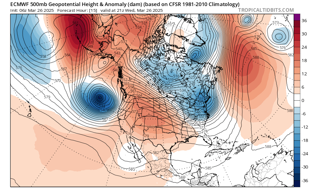 Lots of 70s out there and temperatures are still climbing. Meanwhile, 18,000 feet above us, a “bowling ball” of cold air, strong winds, and precipitation is heading towards us from the southwest. You can see it represented fairly well on this chart below: