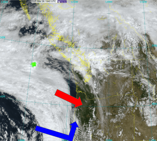 The satellite image from early this afternoon shows this well with Salem (where the red arrow is pointing to) is firmly in the sunny and warm sector ahead of the cold front which is moving up as indicated by the blue arrow.