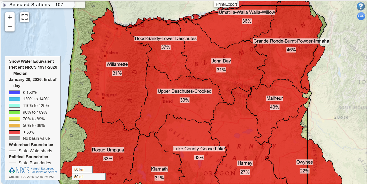 In more modern times, the winter of 1976/1977 stands as the driest on record for many western Oregon locations. Less than an inch of rain fell for the entire month of January that winter, and Salem recorded 68 completely dry days between November through January. Imagine being a ski resort operator that winter or a farmer relying on ground water or seasonal streams to water crops.