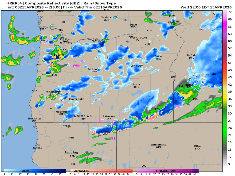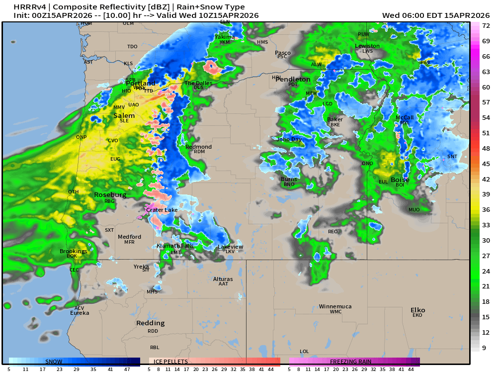 Behind the cold front, temperatures drop dramatically. Probably 8 to 10 degrees within a few hours putting us into the low 40s or even upper 30s Wednesday morning. This next image for 6AM shows the snow level falling quite low behind the front. I’m willing to bet that Silver Creek Falls and locations in the foothills on the east side of the Willamette Valley (Mill City, Gates etc.) will see at least snow falling in the air, and perhaps a slushy coating during the early morning hours. The rest of us, just a cold rain.