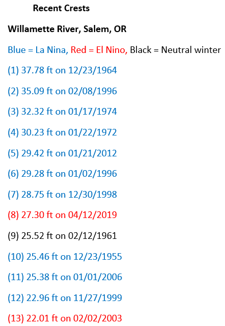 The final piece (which I’ve shared before) is how a La Nina winters often provide us with the correct setup for major flooding on the Willamette River. I’m not predicting it, but it’s also not a coincidence that the vast majority of our highest river crests on the Willamette have occurred during a La Nina winter. I have shared this before, and it’s still up to date I believe.