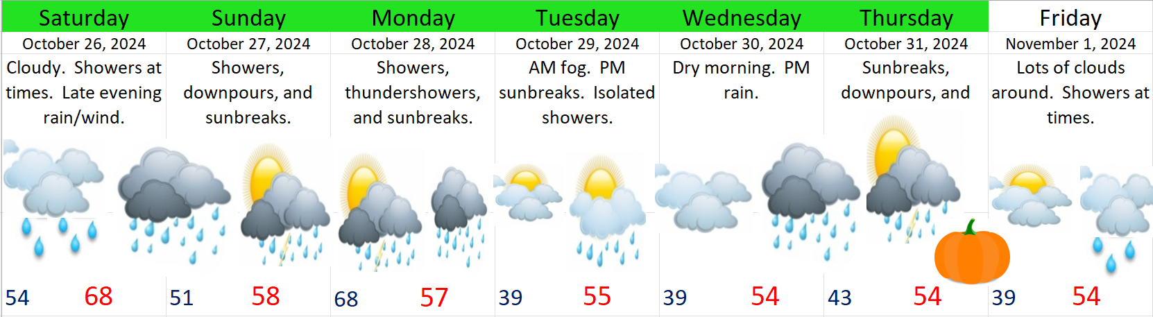 Friday looks dry and partly cloudy. High of 59°. Saturday should be a super nice fall day. Patchy fog to begin the morning followed by afternoon sunshine and highs in the low 70s.