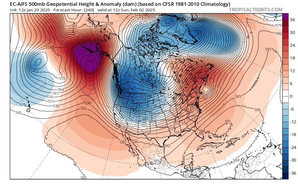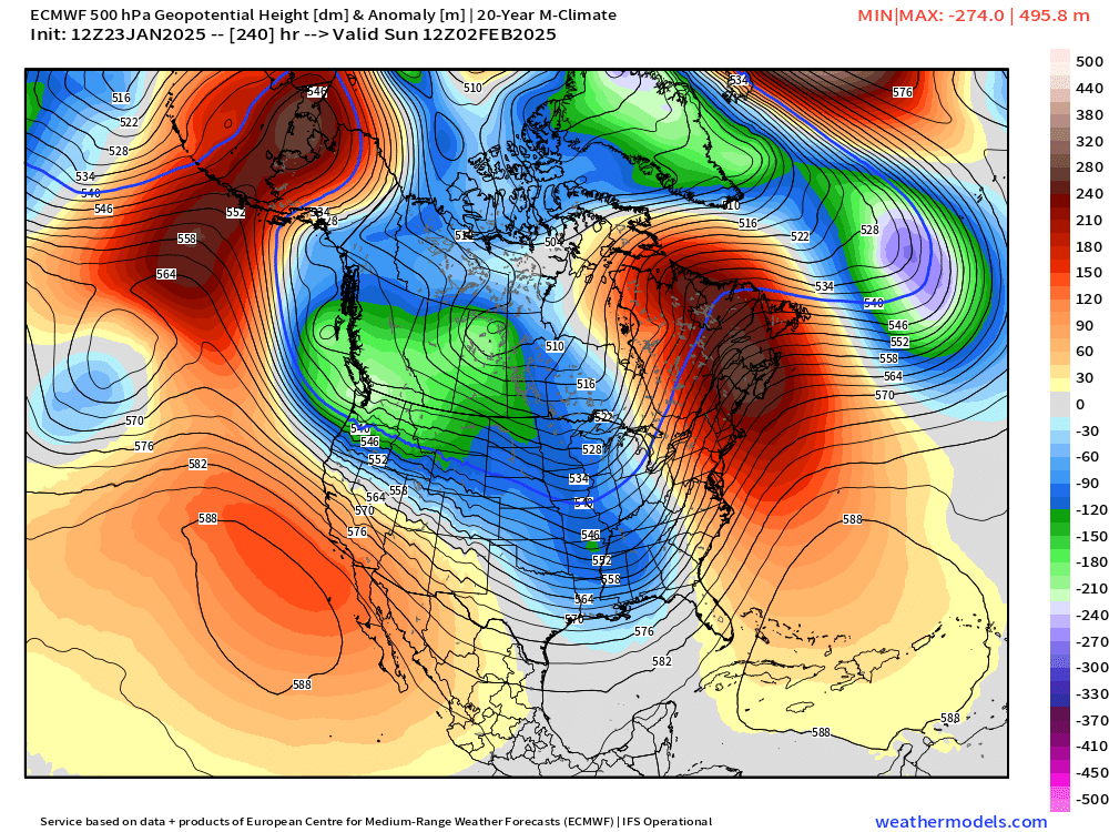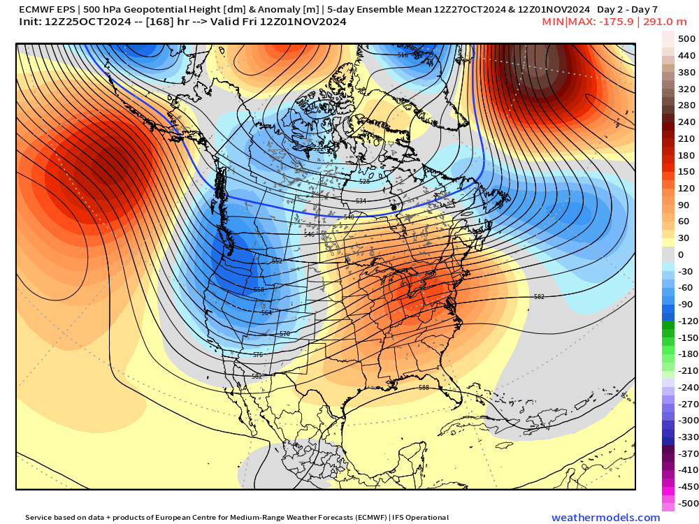 Below is a map showing the 500mb heights compared to normal for Sunday through Thursday of this coming week ( a five day average). Basically, this is a reflection of the weather 18,000 feet up in the atmosphere. Blue means lower pressure and colder than usual, and the orange and red colors indicate higher pressure and warmer than average conditions.