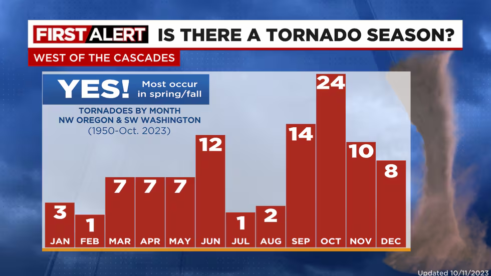 The image below is barrowed from Mark Nelson over at Fox 12 Oregon (the best weather team in Oregon other than yours truly haha). It shows our “tornado season” (if we can call it that) peaks in October. Keep in mind the tornados we have are almost always extremely weak compared to those found in Texas and the Midwest, but still, I found this a little interesting.