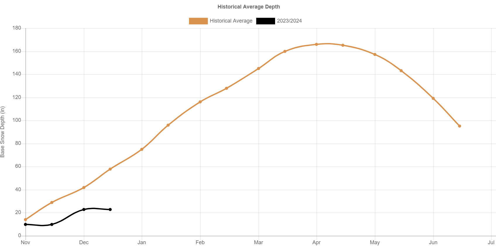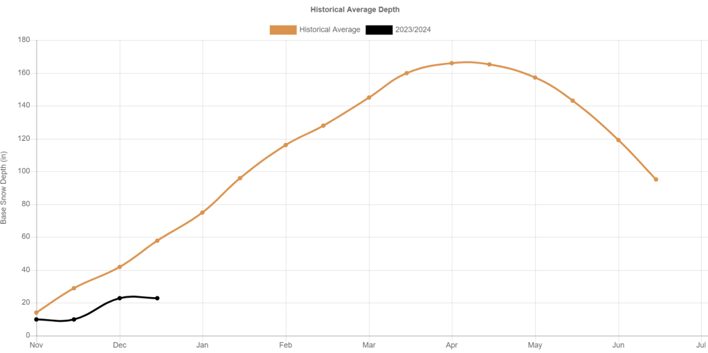 Last winter really was quite mild with only one big exception. That exception of course being the extremely cold and intense winter storm we saw in January. For nearly 5 days our temperatures stayed below freezing. During that time frame we experienced the sleet/ice storm followed by a few days of very cold weather and then a brief freezing rain event that Tuesday; however, the rest of the winter was fairly mild both in the months leading up to that storm, and in the weeks to follow. I distinctly remember sharing this photo at the end of last December revealing the dismal snowpack at Timberline due to the warmer weather.