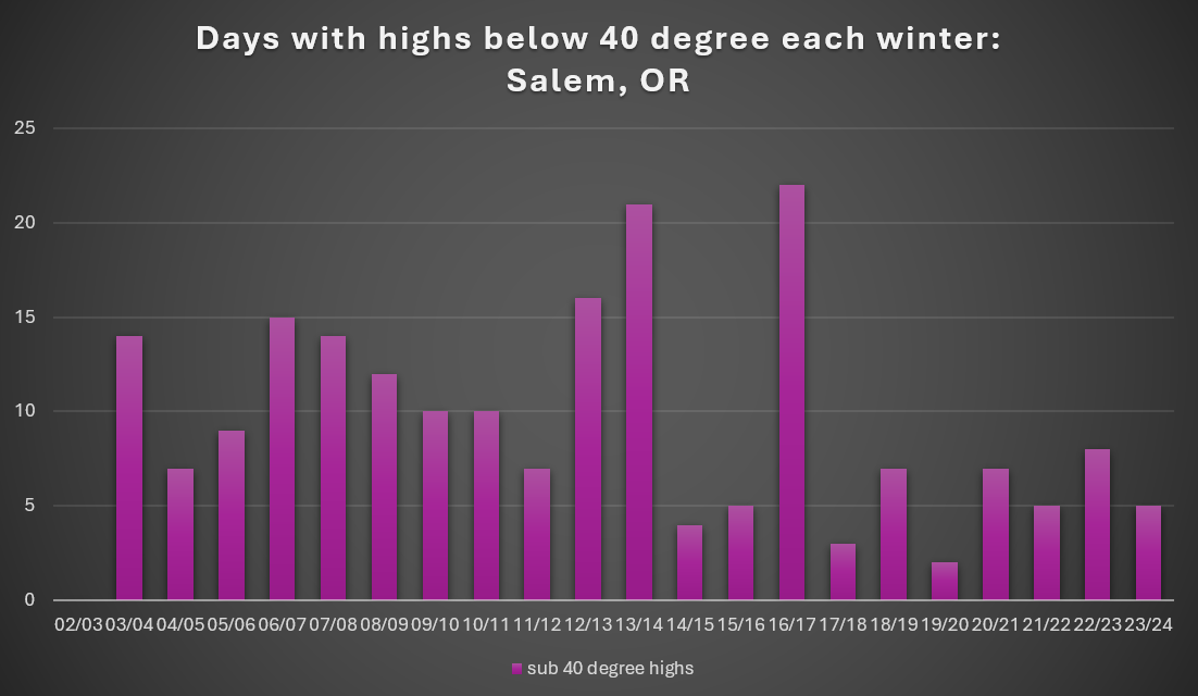 Next let’s look at the total number of days per winter where highs stayed below 40°.