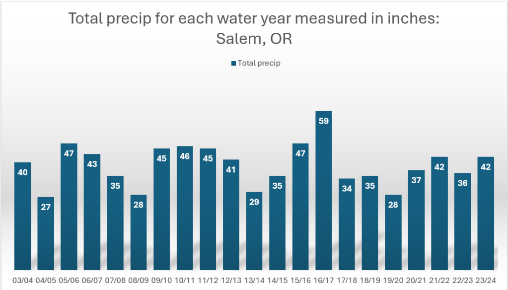 Let’s start with the precipitation. Check out this graph showing total precipitation for each water year in Salem Oregon going back to the winter of 2003/2004.