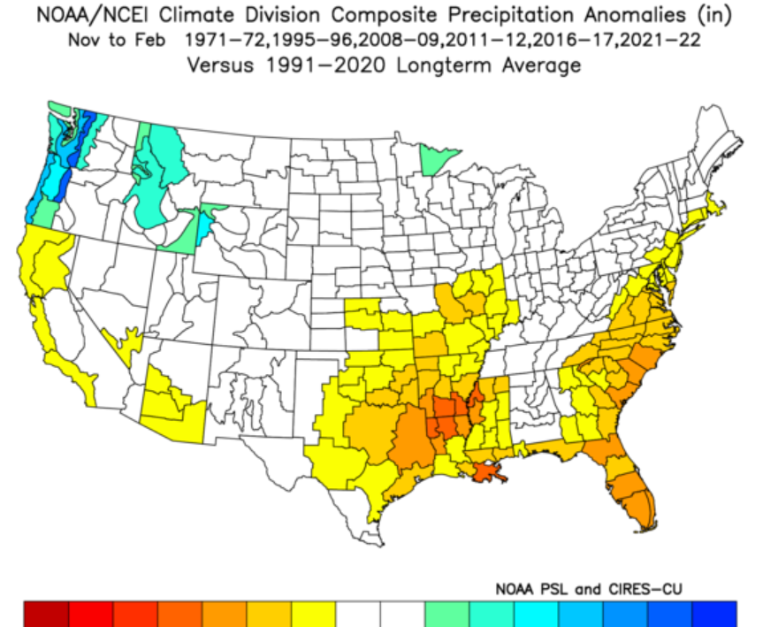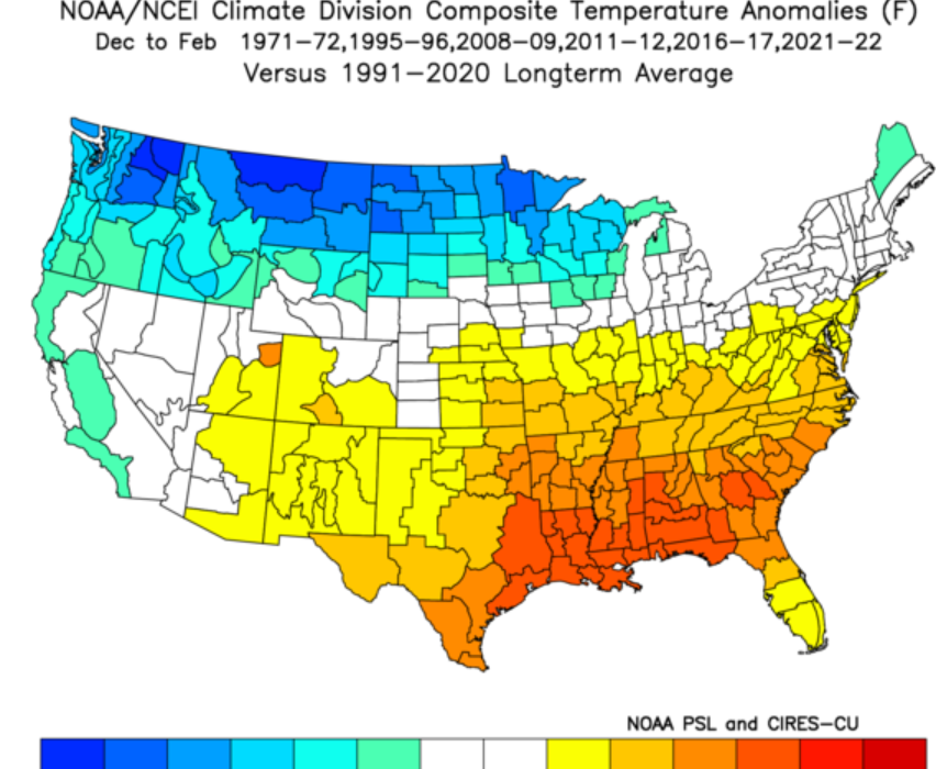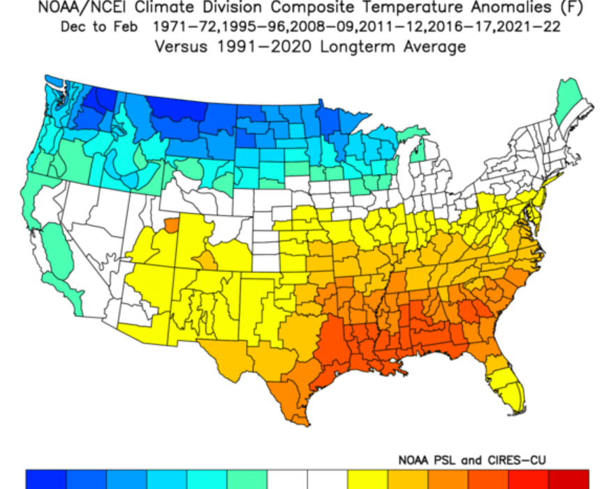 The map below is a composite of surface temperature anomalies for all the years which had similar ocean surface temperatures. Darker blues are much colder than normal areas, and the red and oranges are much warmer than normal areas.