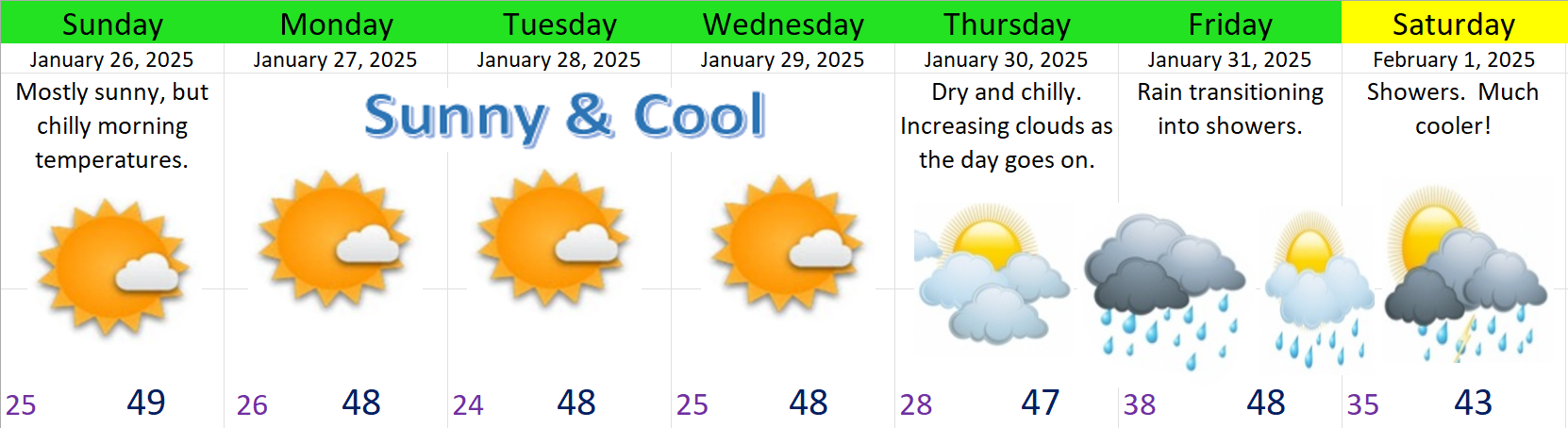 We have about 5 more days of dry weather before rain finally returns to our region Thursday night or Friday. Mostly sunny skies, cold nights, and highs in the upper 40s will continue through Wednesday. Thursday should be dry, but with increasing clouds, and actual rain returns late that night. Showers should continue through next weekend with lowering snow levels. Colder and possibly snowier weather is possible as we head into February. More on that at the end of this post. 🙂