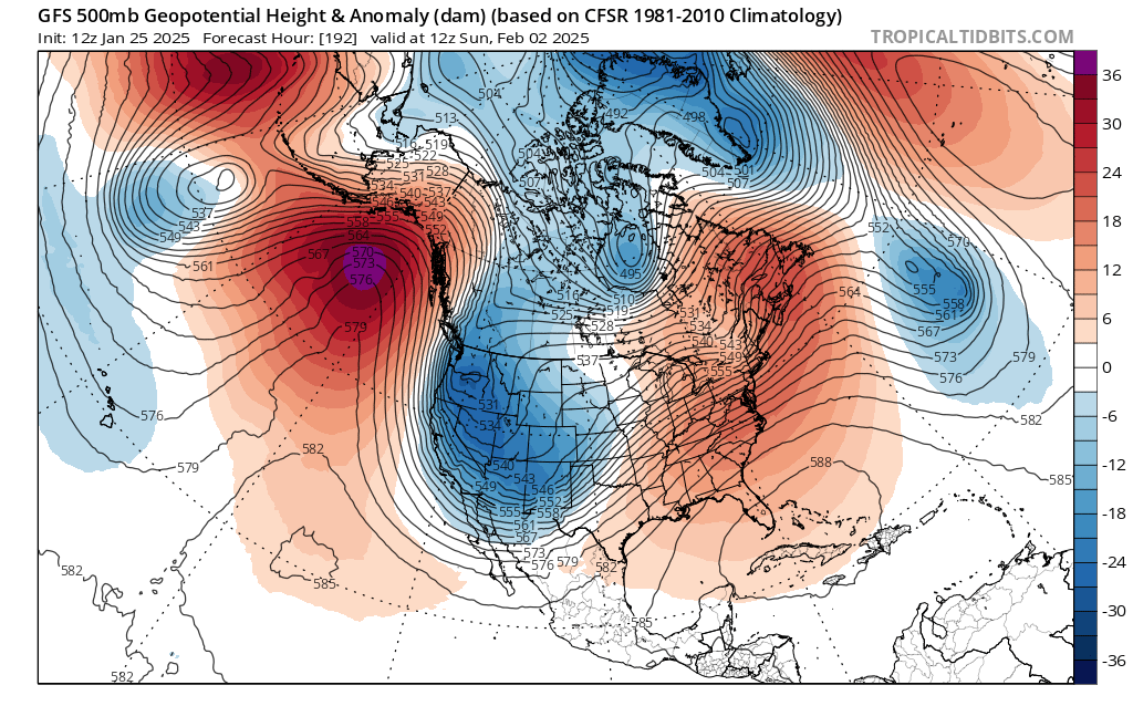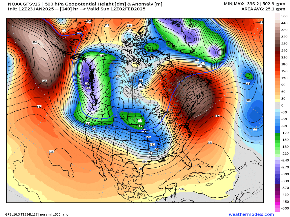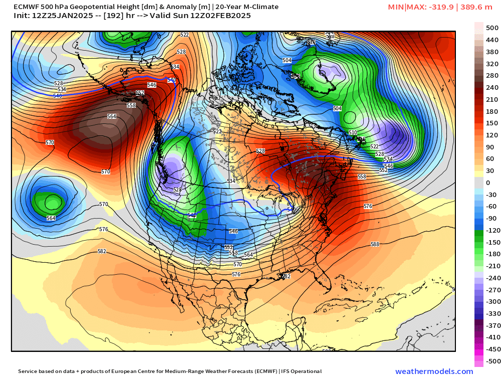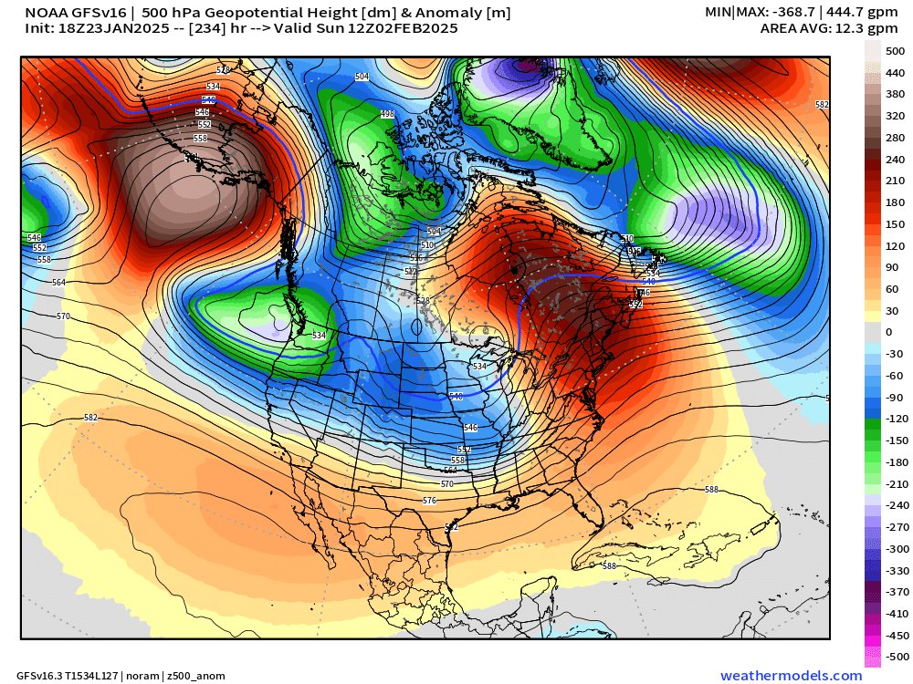 Next Sunday (Feb 2nd) models seem to be honing in on the colder arctic air moving MUCH closer to us, and possibly directly over us. When it’s more than 7 days out like it is at the moment, we look for consistency and trends. Below is a compilation of multiple model runs from the past few days showing the weather pattern up around 18,000 feet up in the atmosphere for Sunday morning February 2nd. Blue and or green shading is much colder than average, and the warm red and orange colors are just that – warmer than average lol… 😉