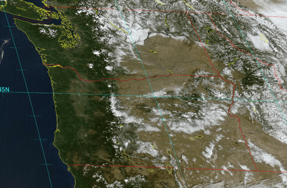 This satellite image shows just how sunny and clear the entire pacific northwest is at the moment. The snow cover in the mountains and higher elevations also really stands out.