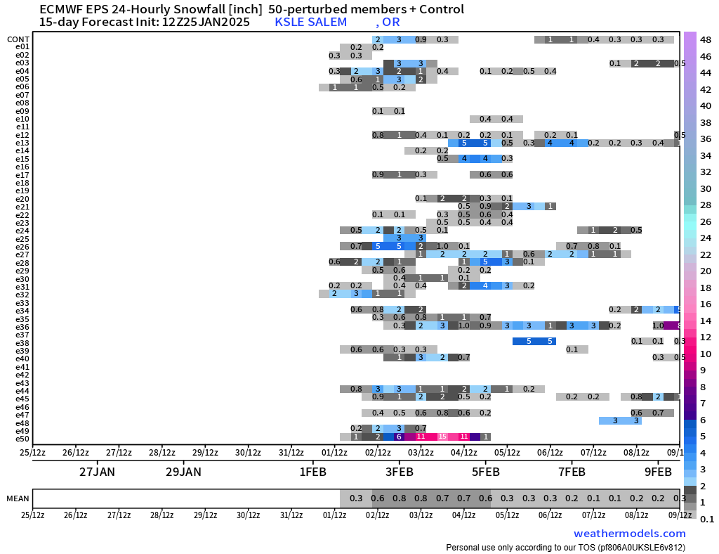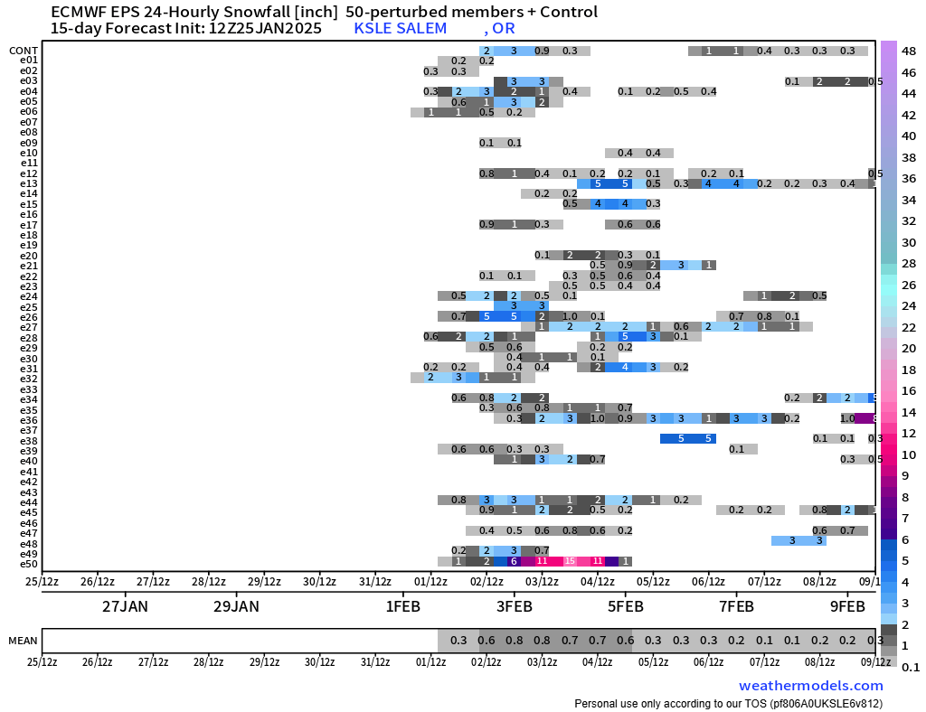 One more little piece of evidence telling us that something snowy might be heading our direction is this final chart which I’ve shared before. Each horizontal line going from left to right is a possible outcome for how many inches of snow Salem could see on those dates (the dates are located along the bottom). This model tends to overdue precip totals a little bit, so pay attention to lines showing 2 or more inches of snow.