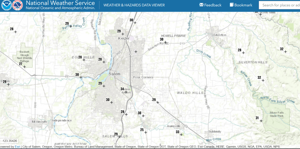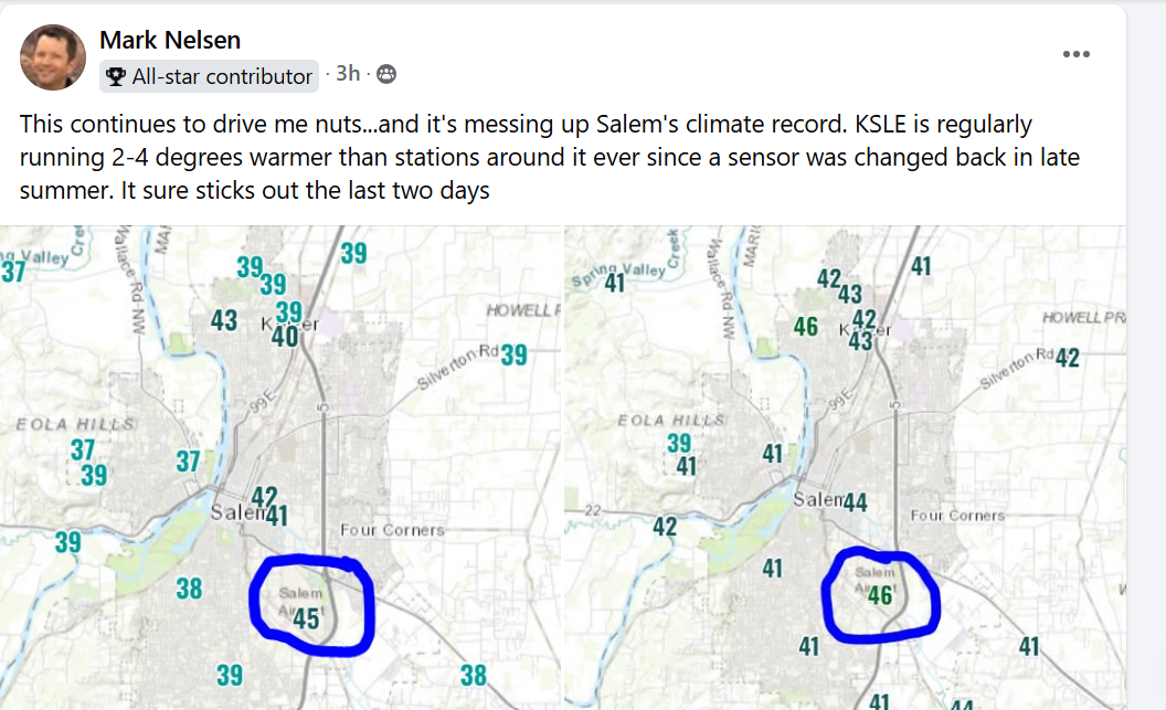 One additional thing I want to mention is how the Salem Airport temperature sensor has been regularly reporting a bit warmer than surrounding stations. Even warmer than weather observation spots in downtown and east along Lancaster Drive. Mark Nelson posted this graphic from the other day showing just how off it’s been and that he has tracked this for a couple years now. He does excellent work for Fox 12 and I appreciate his attention to details and to locations outside the PDX metro if you ever need a good forecaster to watch on TV.