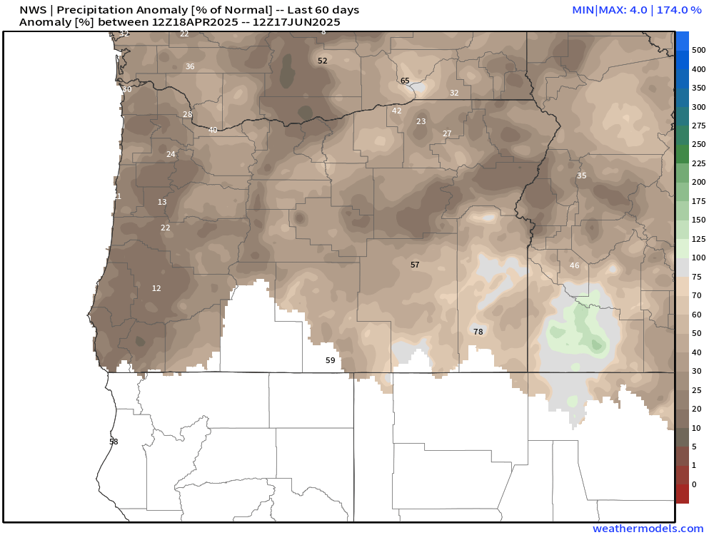 Aside from the first week of April, we have been unusually dry this spring. The few “rainy” days we have seen the past 8 weeks have not produced more than a third of an inch on any given day. The map below shows percent of normal precipitation locations have picked up between April 18th and June 17th. Many valley locations are running at a mere 15 to 25% of average.