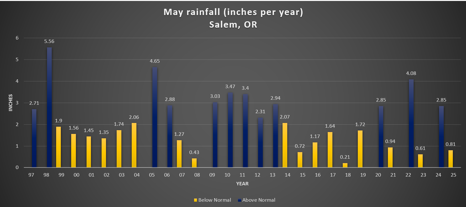 For reference, I added a chart showing total rainfall for Salem during the month of May going back to 1997.