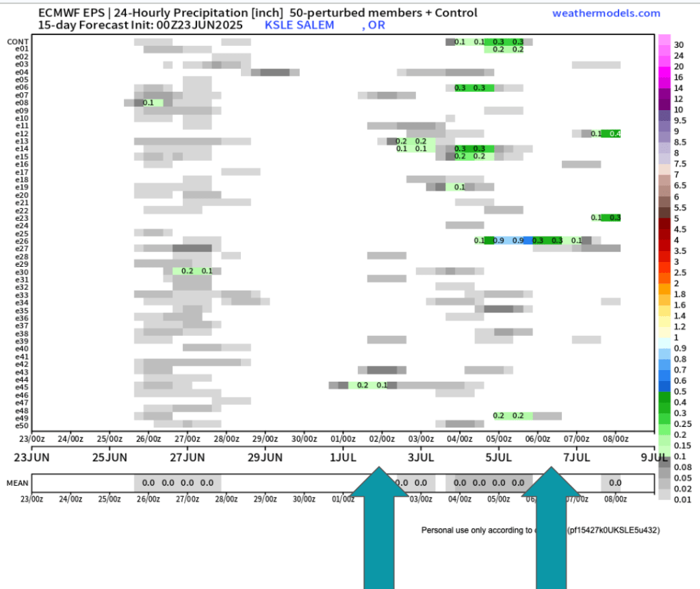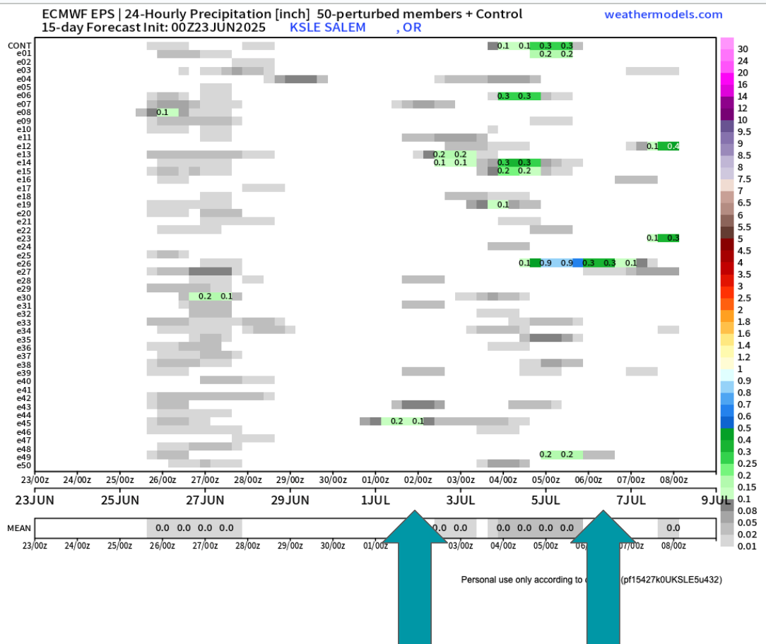 Looking further out to the first week of July it still appears we could have another shot at a few showers. Too far out to say with certainty, but there are enough individual members (horizontal lines) calling for rain at some point during the first week of July that it has my attention.