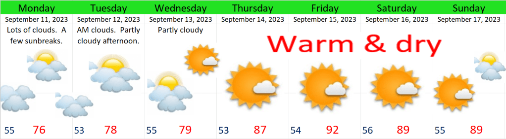 Tuesday and Wednesday of next week look dry, with sunny afternoons, but chilly and possibly foggy mornings. Lows will also be the coldest they have been all fall down to the upper 30s.