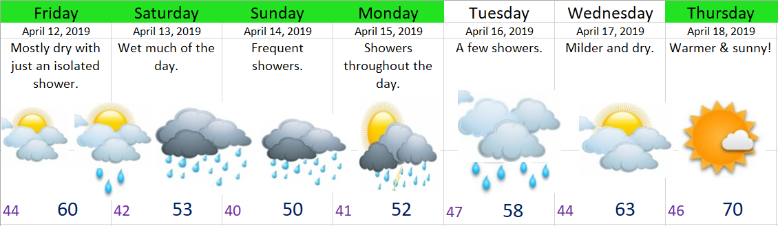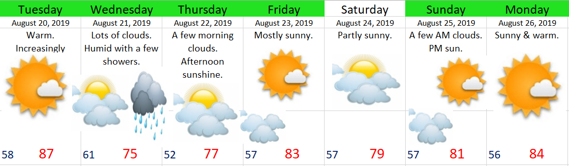 Saturday: Slightly lower confidence Saturday (as noted by the lack of green highlighting). For now I’m leaning towards a partly sunny day with highs around 80°. There’s a weak little “storm” (or more accurately a batch of clouds) I’m watching which could ruin that forecast and keep temps down closer to the low 70s.