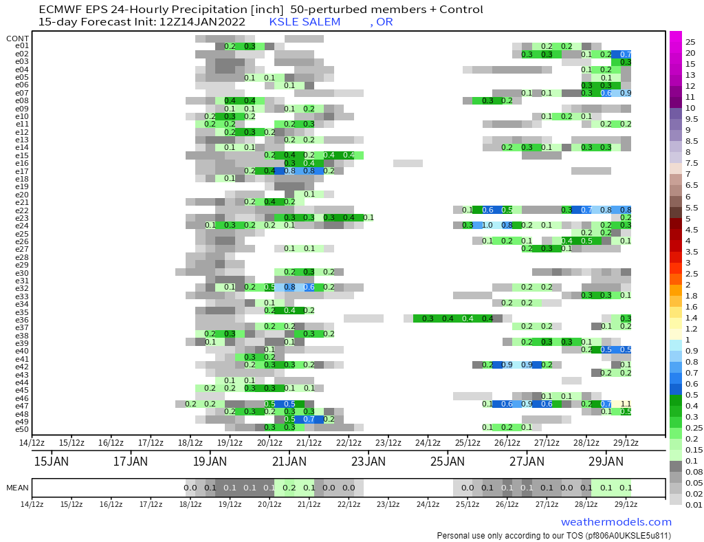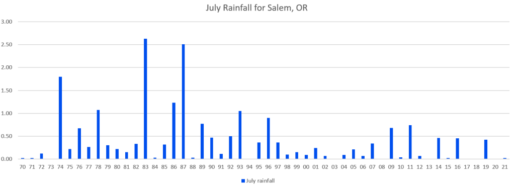 A question I’ve been getting is “will Oregon see a wet summer?” Based off of long range maps, my very best guess is yes, probabilities seem to favor a “wetter” summer. Problem is, this statement can be very misleading and here’s why. Take July for example, on average Salem only sees rainfall between 1 and 2 days each July which means 3 rainy days technically equals a wetter than normal July by that metric. However, if you do the math, this still leaves us with 28 days or 4 full weeks of totally dry weather for the month, so can we really just call 3 rainy days a “wet month?” My answer there is no. If you want to know what a truly wet month looks like then think back to April or last December lol. Hopefully my point is coming across here okay… To help illustrate this further, check out this chart showing total rainfall in Salem for July going back to 1970.