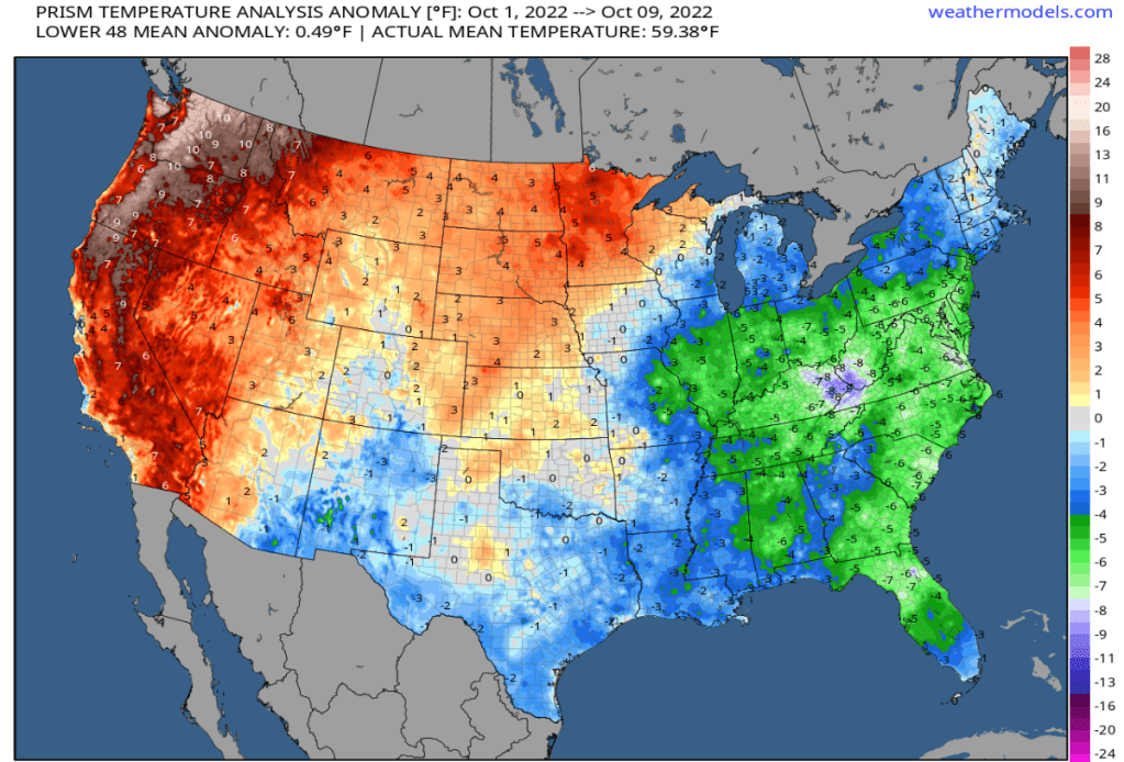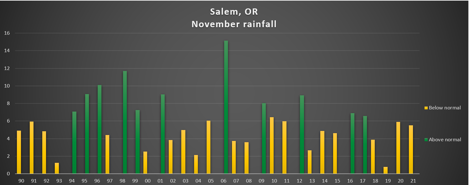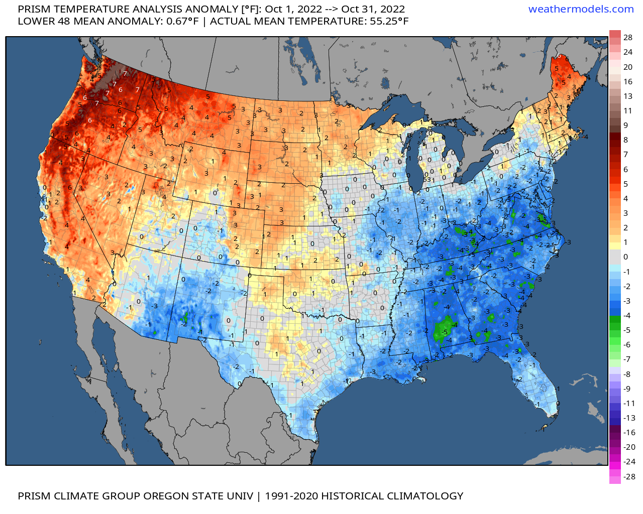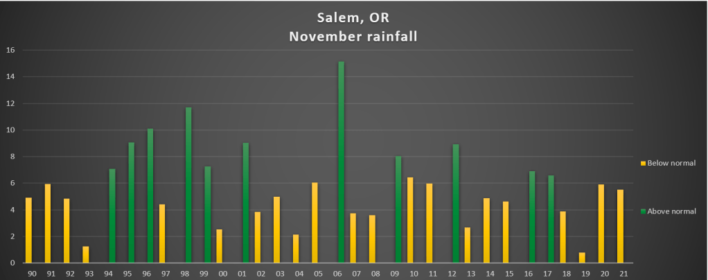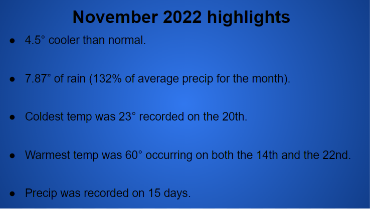 October may have ended on a cooler note, but overall it was quite mild being 2.8 degrees warmer than normal. As far as precipitation goes, we finished the month above average with a total of 3.8″ to kick off our new water year. Average for October is 3.47″. Over 2 inches of that rain fell during the final week of the month.