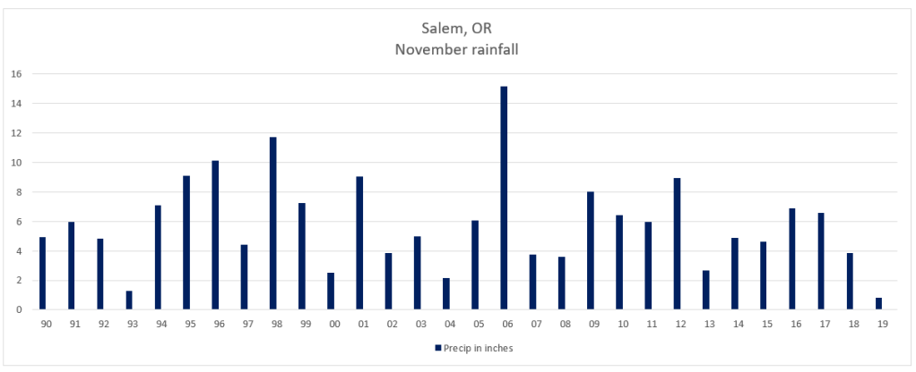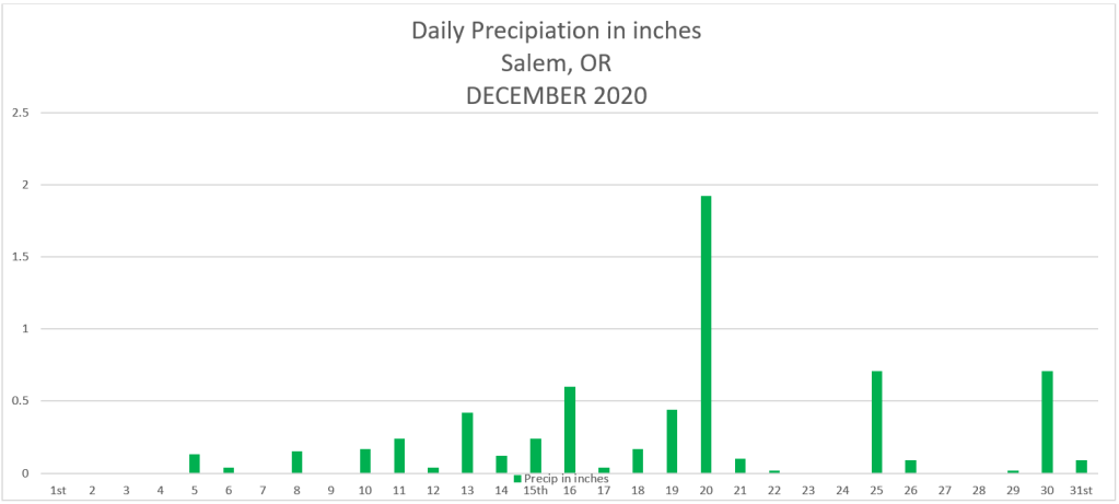 The rainstorm on the 20th brought 1.92 inches of rain to Salem (our wettest day of the month) and was probably the biggest and really the only highlight of what ended up being a rather boring month as far as weather action goes. The mountains continued to pick up just enough snowfall through the course of the month to allow for plenty of skiing opportunities over Christmas break. A huge plus for that industry.