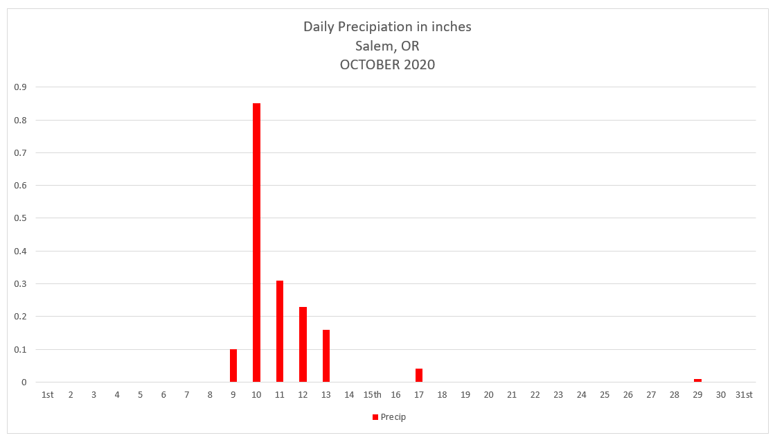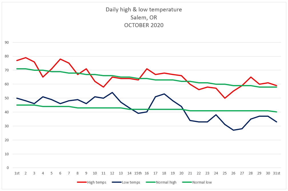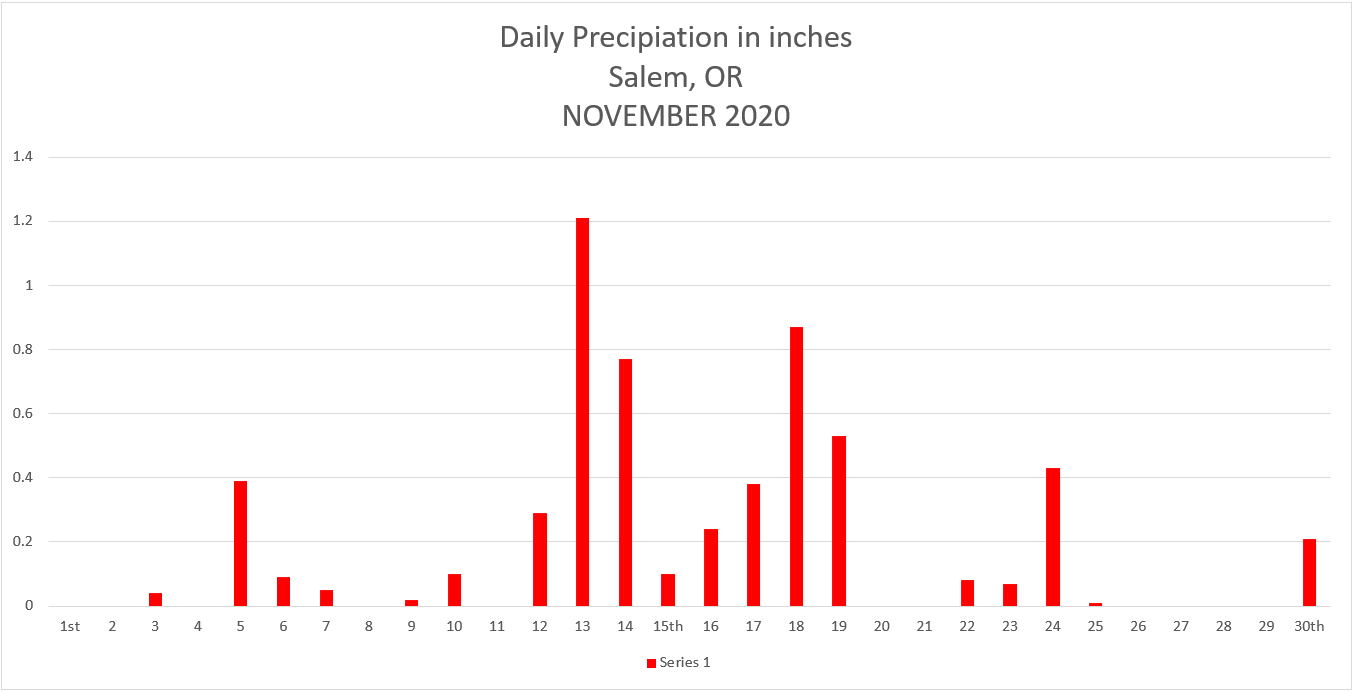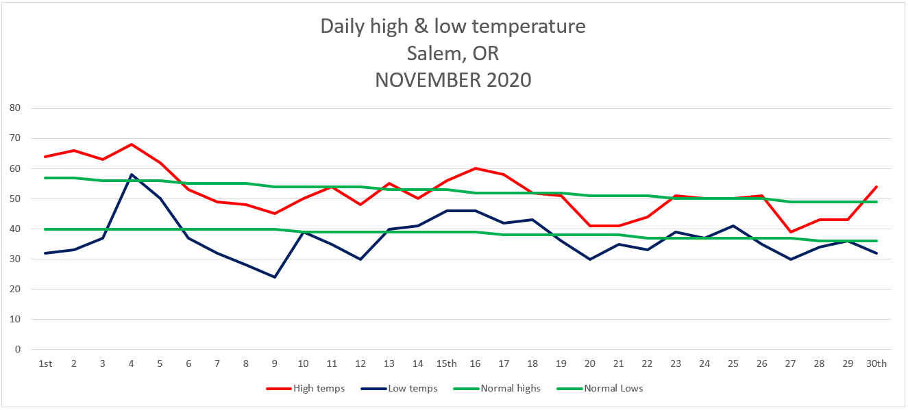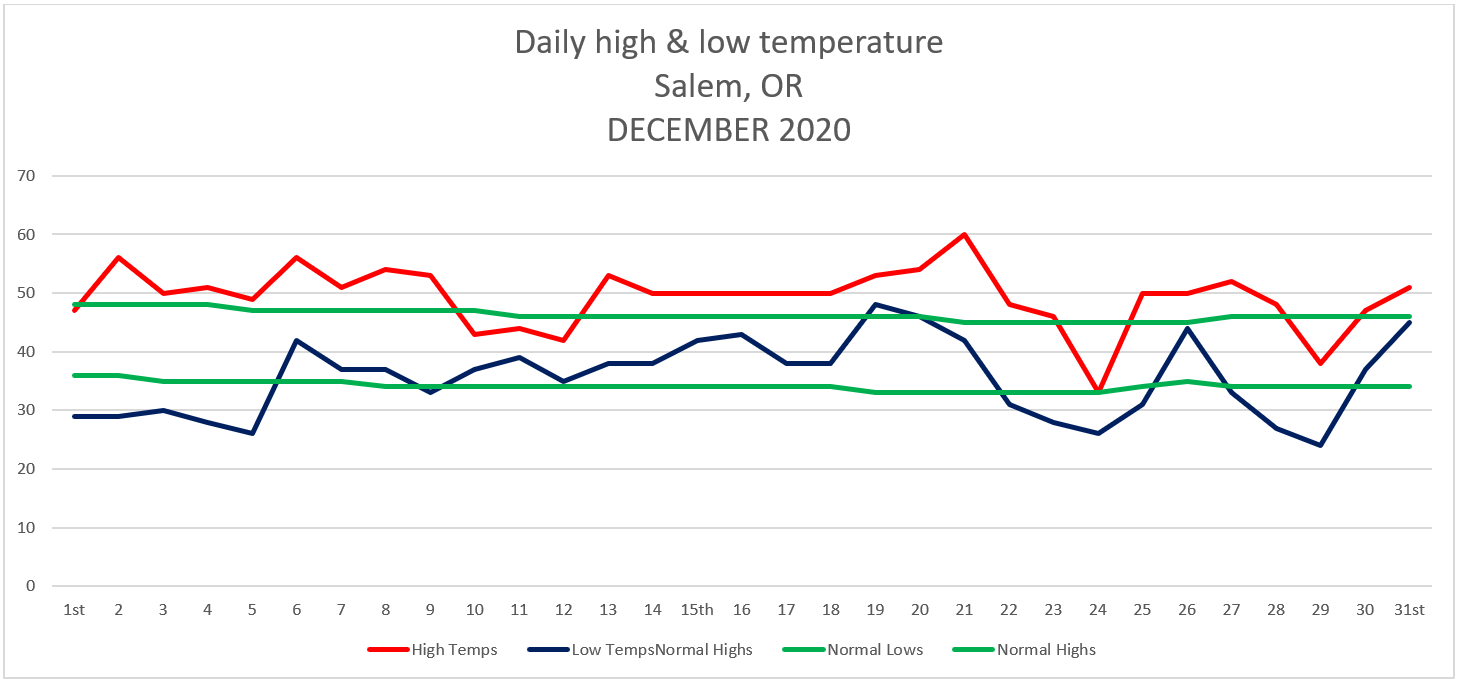 Here are the December 2020 states for Salem. We ended December slightly drier than normal with 6.45″ or 94% of average for the month. On the temperature side of things we ended up being quite a bit warmer than normal overall averaging 2.48° above normal.. Yes we had some very chilly days right around Christmas, but generally we stayed on the warmer end of things.