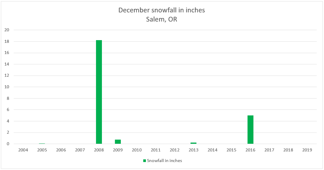 As far as snow goes once again we went another December without any snow here in Salem. Last spring I posted these statistics showing total snowfall per month over the past 10 years for here in Salem.