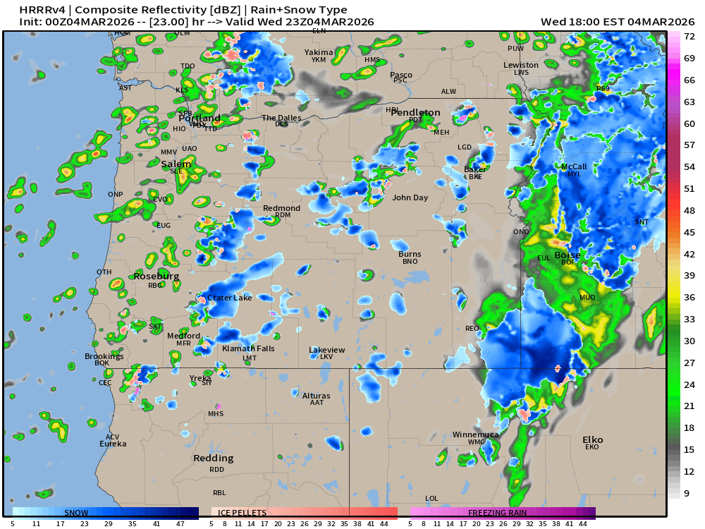 Coast Rang passes: Heavy showers at any point could briefly lay down a slick layer of snow or graupel (snow/ice pellets). Besides those exceptions, Coast Range roads remain just wet during the daylight hours turning snowy/slushy, or even a little bit icy during the nighttime and morning hours.