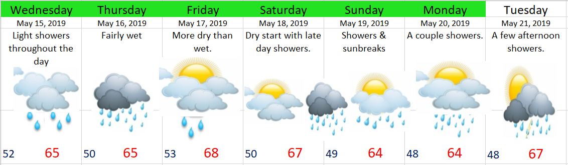 As far as the weather goes, it looks like we have a slight chance for showers on Thursday, and then again from Tuesday through Friday of next week. Not a washout by any means, but showers appear to be likely each of those days. I will have more details concerning next week’s shower chances in a day or two, at which time I will try to give another update.