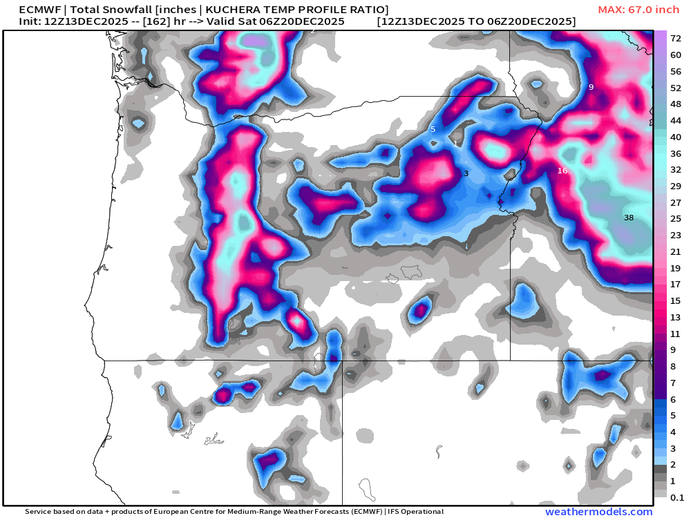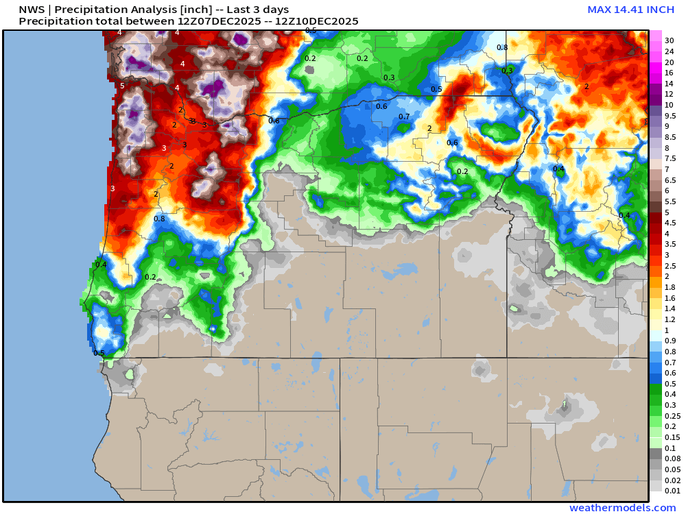 You can see how effective the mountains are in this pattern at ringing out available moisture with 8 to 10 inches falling in parts of the Coast and Cascade ranges.