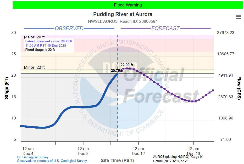Focusing on the mid Willamette Valley, it appears as though the biggest flooding issues were a few closed streets, some flooded parking lots, and a lot of field flooding outside of town. No major/widespread flooding here. Both the Luckiamute and Pudding rivers are still rising, and will peak this afternoon/evening. Here’s a forecast for the Pudding River by the time it reaches Aurora.