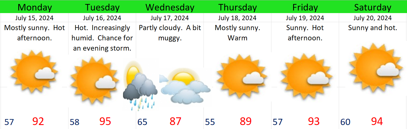 Wed – Sun: The remainder of the following week will be warm, mostly sunny, and dry. Fairly normal summer weather. Highs on the upper end of “normal” topping out in the upper 80s to near 90°. Lows in the mid 50s.