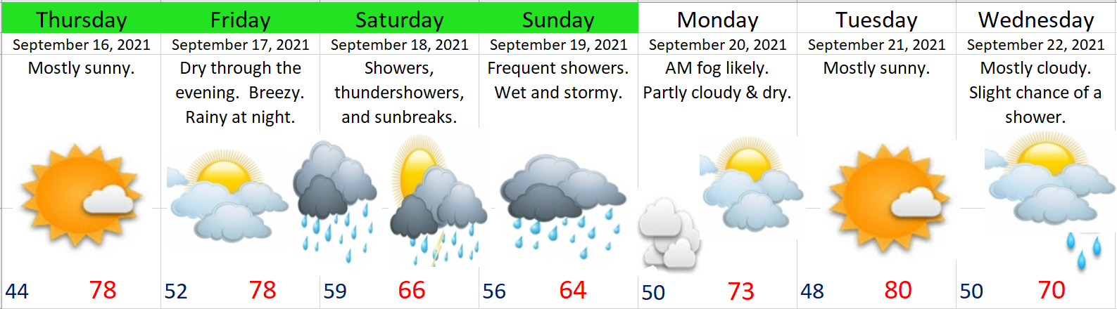 Forecasting confidence goes down on Wed as it looks like we will be on the edge of a weak system. For now plan on a mostly cloudy day with a light shower or two – nothing big.
