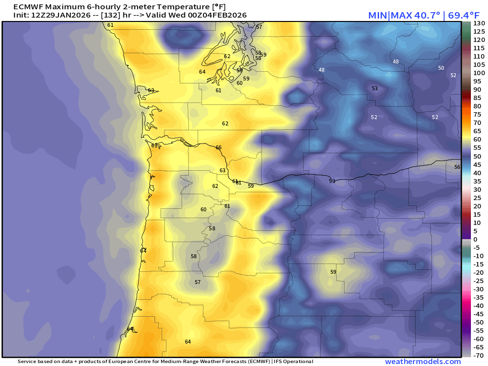 Overall, a great stretch of weather on tap next week. I feel pretty confident the nice dry weather lasts through next Friday (Feb 6th), and possibly through the 7th. Lots of mid to upper 50s, and maybe a 60° day mixed in there for mid Willamette Valley.