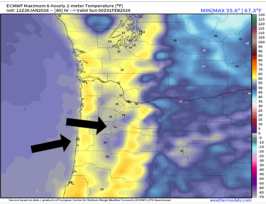 Then check out Tuesday! Fog is the only factor (sometimes difficult to predict several days out) that could hinder high temperatures Tuesday. Regardless, Tuesday’s going to be a very mild day for the pacific northwest. Mid to upper 60s likely along the coast. Should be great weather at our beaches! Look at those high temps for Tuesday. 🙂