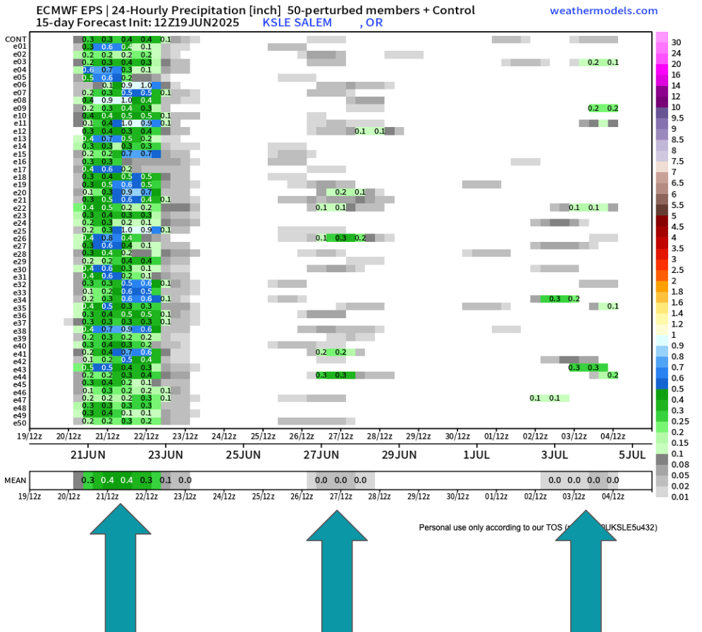 Monday night through Wednesday: Steady rain during the majority of both these days with frequent periods of heavier rain. Winds will be pretty gusty at times throughout this period too. I’m thinking gusts 35 to 40mph. Not real strong, but if soils are saturated, and they will be, I could see a few isolated instances of trees coming down here in the valley and along with those trees, some power lines. Please be prepared for some power outages next week.